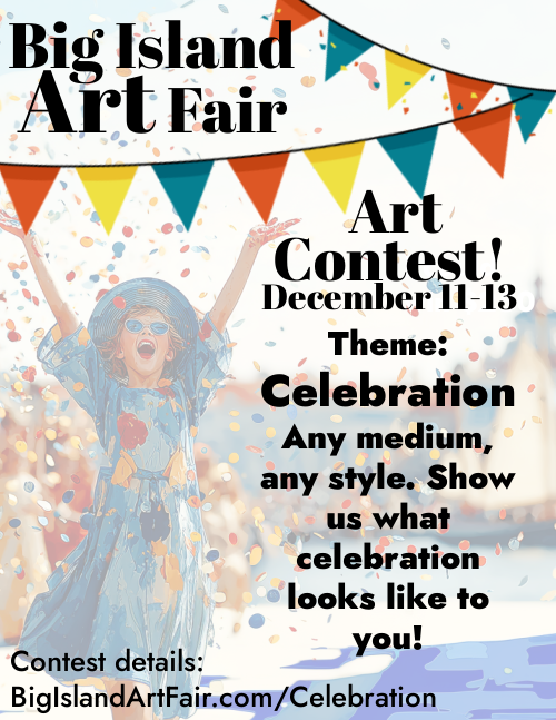Artists should submit an artwork that fits the December theme of “Celebration”. Show us what Celebration means to you! There are no restrictions on size or materials and all mediums are acceptable*. Artwork shall be an Artist original work, NOT AI generated, and not previously entered into a Big Island Art Fair contest.